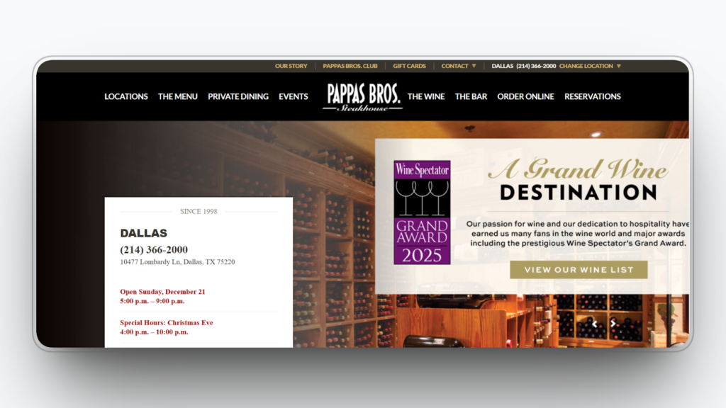 Pappas Bros. Steakhouse Dallas is a strong choice when you want a high end private dining experience with a more formal feel. It fits business groups and celebrations where the goal is polished service, a quiet room, and a steakhouse menu that feels premium from start to finish.